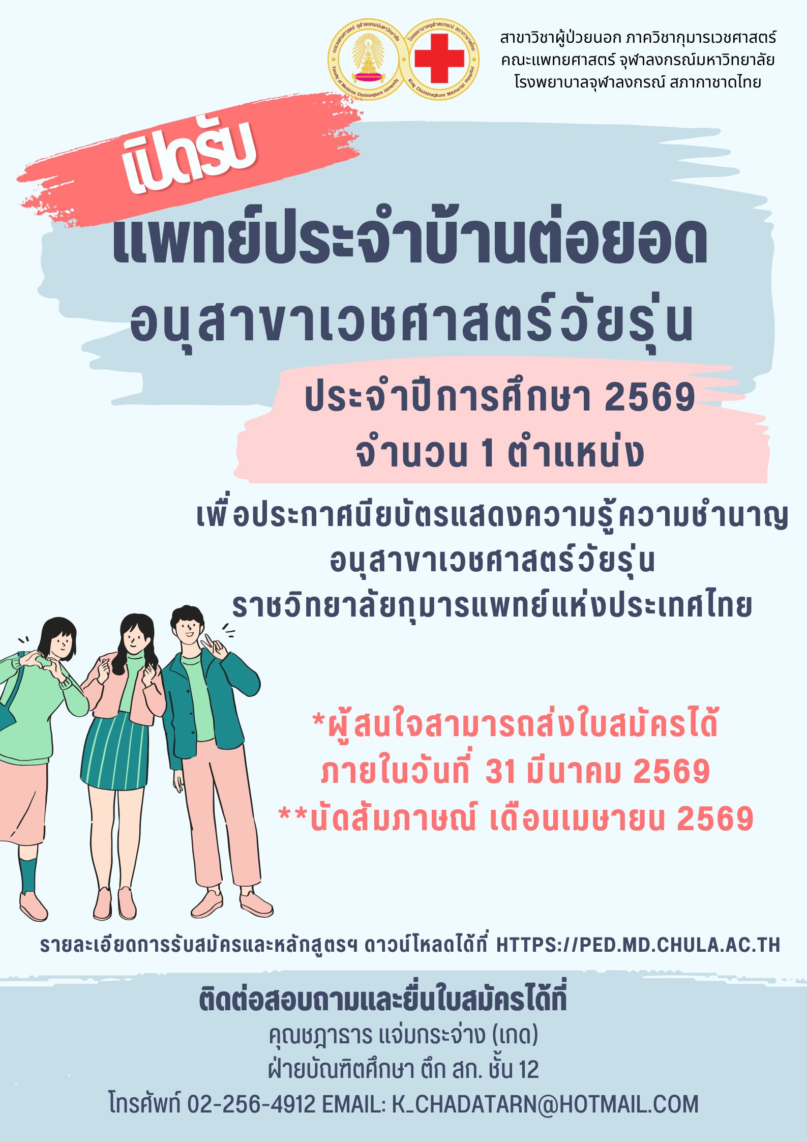 เปิดรับสมัครแพทย์ประจำบ้านต่อยอด สาขากุมารเวชศาสตร์ผู้ป่วยนอก อนุสาขาเวชศาสตร์วัยรุ่น ปีการศึกษา 2569